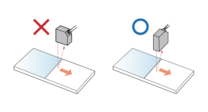 被檢物的材質(zhì)‘顏色存在明顯差異的情況時(shí),請(qǐng)將激光位移的投光光軸和受光光軸構(gòu)成的平面平行于被測(cè)物材質(zhì)(或顏色)差異分界線,這樣可以減少測(cè)量的精度誤差。