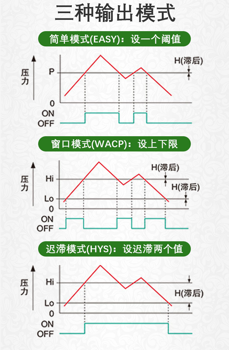 ECOTTER數(shù)顯壓力表可實(shí)現(xiàn)智能檢測,多種輸出模式,簡單模式可設(shè)置一個(gè)閥值,窗口比較模式能設(shè)上限和下限兩個(gè)閥值,進(jìn)行區(qū)間輸出。還有應(yīng)差模式,設(shè)置兩個(gè)閥值,起到遲滯的效果。