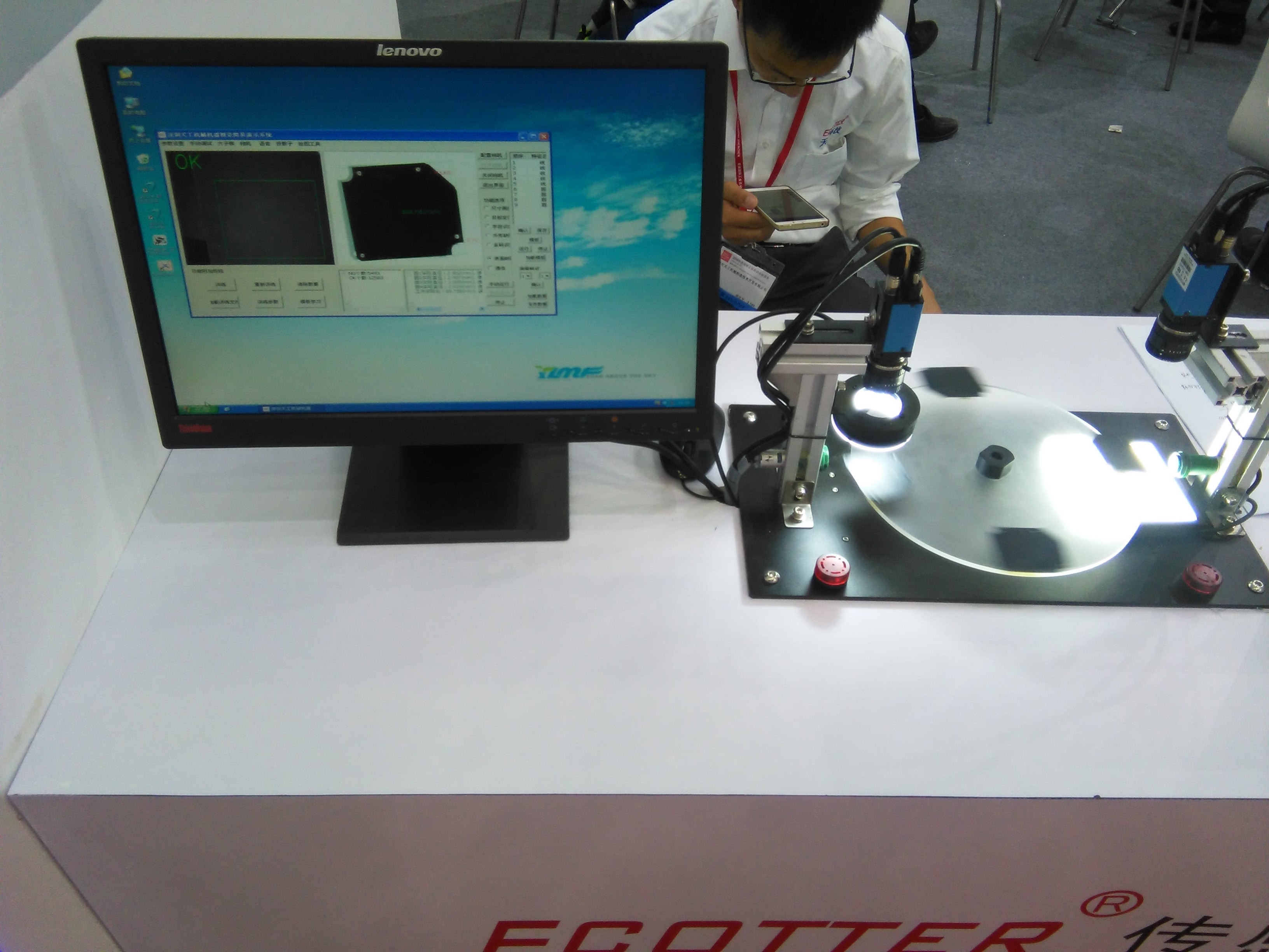 DEMO展示,制作了一個(gè)旋轉(zhuǎn)附有檢測(cè)物體的轉(zhuǎn)盤,利用機(jī)器視覺(jué)對(duì)其進(jìn)行尺寸、表面瑕疵等準(zhǔn)確的檢測(cè)。