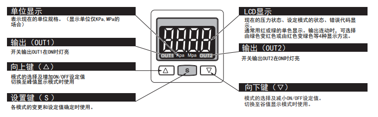 壓力傳感器的外形小巧,正面為LCD顯示和三個操作按鍵;背面為電源接入口和氣壓接入口。