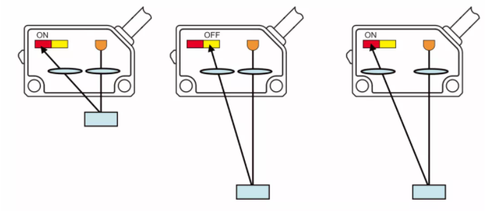 普通的漫反射光電開(kāi)關(guān),依據(jù)物體反射的入光量大小做出反應(yīng)。由于物體反射的光值會(huì)受到工件的材質(zhì)、顏色、尺寸、形狀等因素的影響,所以用普通漫反射光電開(kāi)關(guān),檢測(cè)不同顏色的工件時(shí),檢測(cè)距離會(huì)不一樣。