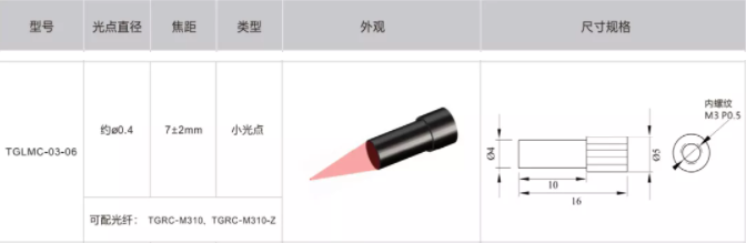 聚焦型聚光鏡TGLMC-03-06,檢測距離7±2mm,光斑直徑約Φ0.5mm。超小的光斑可以檢測細小尺寸的物體,或提供精準的定位檢測。