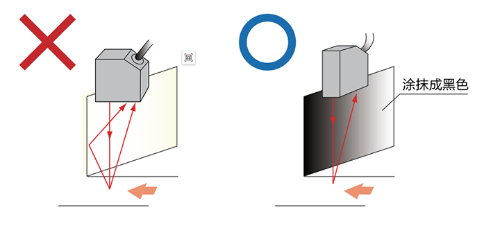 被測(cè)物為黑色物體時(shí),反射光量較少,使得受光素子的受光量較少,導(dǎo)致分辨率下降??梢酝ㄟ^(guò)縮短檢測(cè)距離,讓有效測(cè)量范圍內(nèi)盡可能的縮短傳感器的檢測(cè)距離,確保受光素子接收到足夠的受光量。也可以【正反射】方式傾斜安裝,時(shí)激光的入射角等于反射角,這樣提高受光素子接收的受光量。
