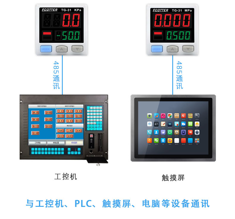 ECOTTER 通訊款485壓力開關(guān)可以傳輸氣壓數(shù)據(jù)給到系統(tǒng)進行分析使用,可以與工控機、觸摸屏等設(shè)備互動,執(zhí)行命令、顯示數(shù)據(jù)到連接屏上??梢詫崿F(xiàn)自動化更智能的控制及管理。