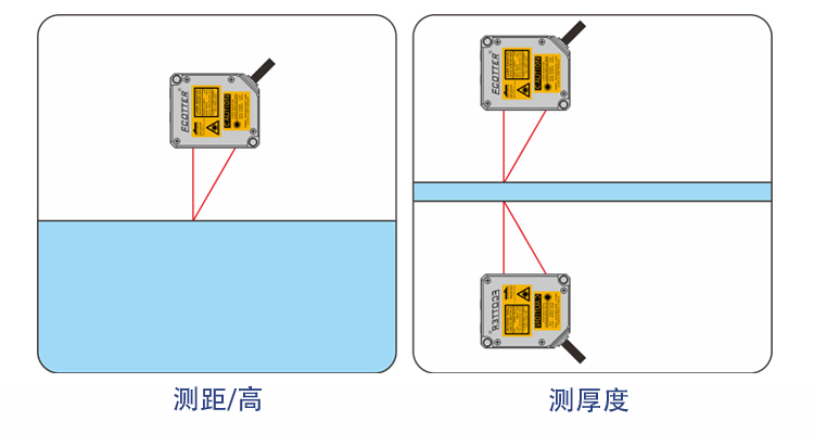 測距、測高是比較簡單的應用,傳感器輸出的數(shù)據(jù)可以直接使用,測厚則需要進行計算,將兩個激光傳感器在固定的距離L進行安裝,讀取兩個距離A和B,厚度H=L-A-B。