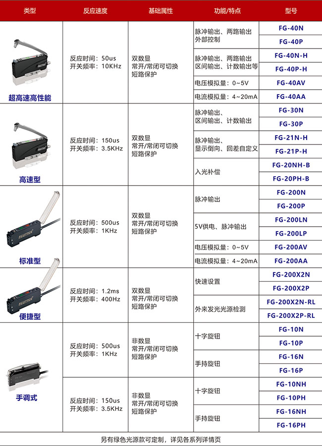 ECOTTER光纖放大器穩(wěn)定性佳,功能種類可選,有超高速高性能款FG-40系列,達到10Hkz的開關頻率,支持兩路輸出。高速型達到3.5KHz,配備了區(qū)間輸出、計數輸出。標準型開關頻率1KHz,便捷型400Hz,可最快速設置閥值,還有手調式的光纖放大器。