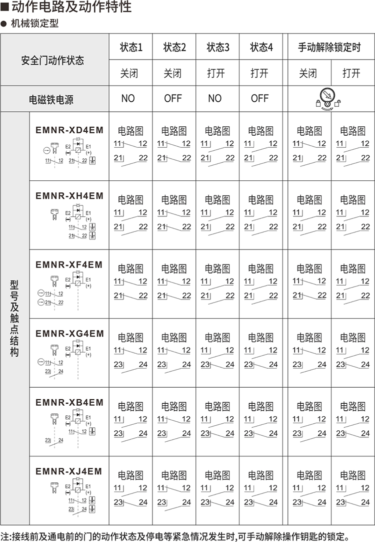 在安全門(mén)鎖選型時(shí),我們首先需要了解到安全門(mén)鎖可以提供的功能是通過(guò)電磁鎖和鑰匙控制觸點(diǎn)通斷,然后我們規(guī)劃出,需要插鑰匙時(shí)觸點(diǎn)的狀態(tài)需要是導(dǎo)通還是斷開(kāi),門(mén)鎖上電或斷電時(shí)觸點(diǎn)的狀態(tài)又是怎樣的需求。