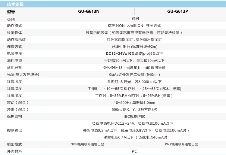 ②如導(dǎo)管內(nèi)有液體,投光部發(fā)出的光將穿透液體,不進入受光元件。(遮光狀態(tài))