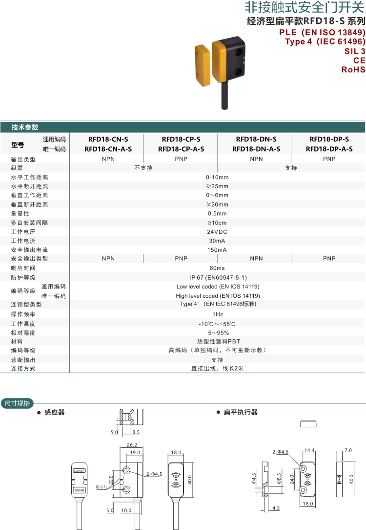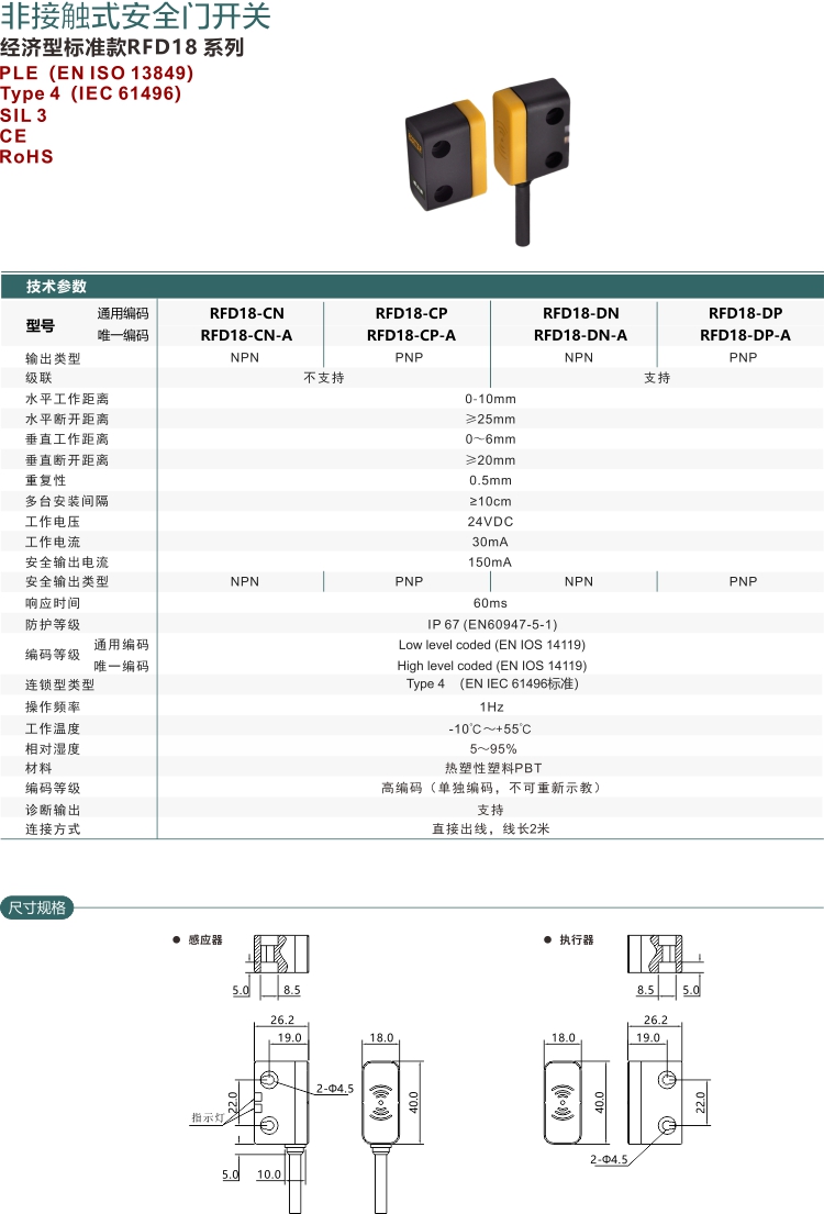 非接觸式安全門開(kāi)關(guān)采用無(wú)線射頻識(shí)別應(yīng)用技術(shù),無(wú)論周圍發(fā)生何種變化,都要安全地進(jìn)行開(kāi)關(guān),非接觸式安全開(kāi)關(guān)工作穩(wěn)定可靠??梢愿鶕?jù)風(fēng)險(xiǎn)評(píng)估和機(jī)器設(shè)計(jì)的要求使用。