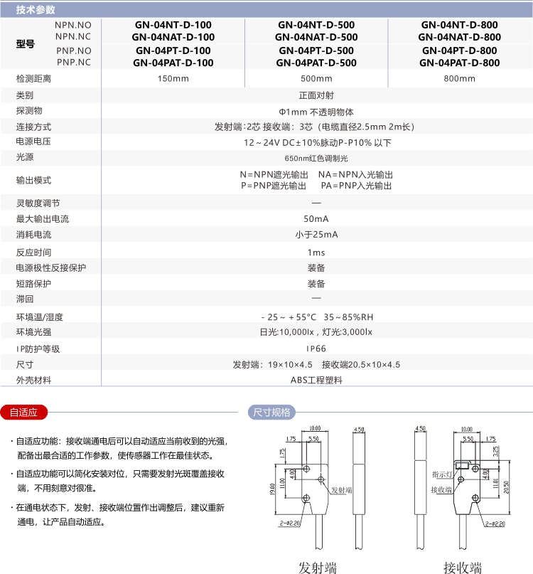 這款超薄光電是小光斑對射型,采用小光斑尺寸設(shè)計,500mm處光斑僅為中30mm,并配備方便觀察的雙色指示燈--紅色電源指示燈與綠色輸出指示燈。