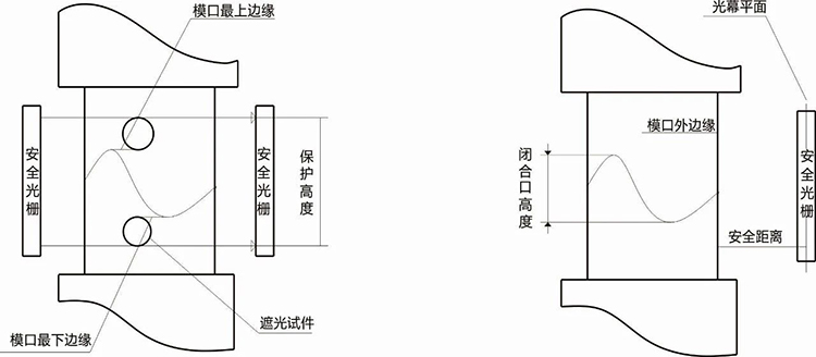 安全光幕高度位置是指安全光柵的光幕相對(duì)于機(jī)床上下??诘奈恢?。在保證安全間隔的條件下,安全光柵的最下一束光不得高于??谙逻呇?,最上一束光不得低于??谏线呇?。