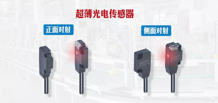 ECOTTER 超薄光電對射型 GN-04T系列產(chǎn)品為目前面市場自動化應(yīng)用中最小規(guī)格的光電型傳感器,它的最重要的特點是:小巧、薄的體型結(jié)構(gòu),只需擁有些許空間,即可安裝。并且檢測距離更長,最大可達500mm。具有正面對射和側(cè)面對射兩種款式可供選擇。