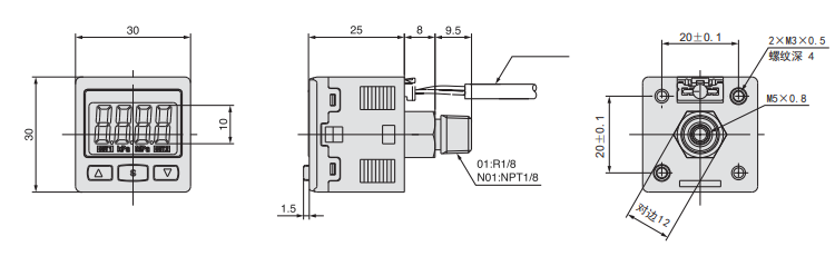 壓力傳感器的外形小巧,正面為LCD顯示和三個操作按鍵;背面為電源接入口和氣壓接入口。