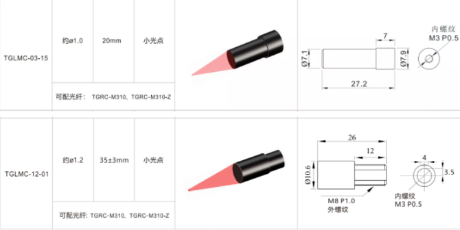 聚焦型聚光鏡TGLMC-03-15,檢測距離20mm,光斑直徑約Φ1mm。聚焦型聚光鏡TGLMC-12-01,檢測距離35±3mm,光斑直徑約Φ1.2mm。這兩款聚光鏡的檢測距離要比TGLMC-03-06遠,客戶可以根據(jù)安裝的高度進行選擇合適的聚光鏡。以上四款聚光鏡都適用于M3的同軸光纖。